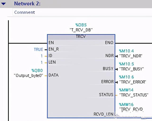 因为与发送使用的是同一连接,所以使用的是不带连接的发送指令“TRCV”,连接“ID”使用的也是“TSEND_C”中的“Connection ID”号,如图4所示。