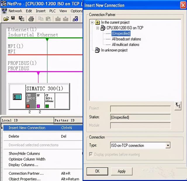 打开 “NetPro” 配置网络,选中 CPU,在连接列表里建立新的连接并选择连接对象和通信协议,如图7所示。
