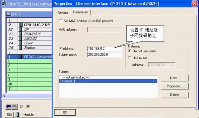 进入“HW Config”中,组态所使用的 CPU 及“CP343-1”模板。并新建以态网 Ethernet (1) ,配置“CP343-1”模板IP 地址为:192.168.0.2,子网掩码为:255.255.255.0 。如图6所示。配置完硬件组态及属性,编译存盘并下载所有硬件组态。