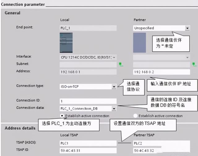 S7-1200 CPU中,使用 TCP 协议与S7-300通信时,PLC_1的连接参数,如图12所示。通信伙伴 S7-300 的连接参数,如图13所示。