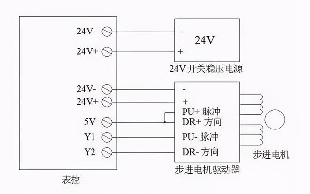 第二步,连接步进电机驱动器的电源,如果在我们的步进电机使用直流24V供电可以与表控共用一个开关电源来供电。 第三步,来看一下连接步进电机驱动器与表控的控制接线: 1、将步进电机驱动器脉冲输入信号和方向输入信号的正极连接到表控的5V端子。 2、将步进电机驱动器脉冲输入信号的负端连接到表控的Y1输出端子上。 3、将步进电机驱动器方向输入信号的负端连接到表控的Y2输出端子上。 4、接下来就是设置步进电机驱动器的细分,一般可以放在8(1600)左右,通过初步调试后设置实际需要的细分。