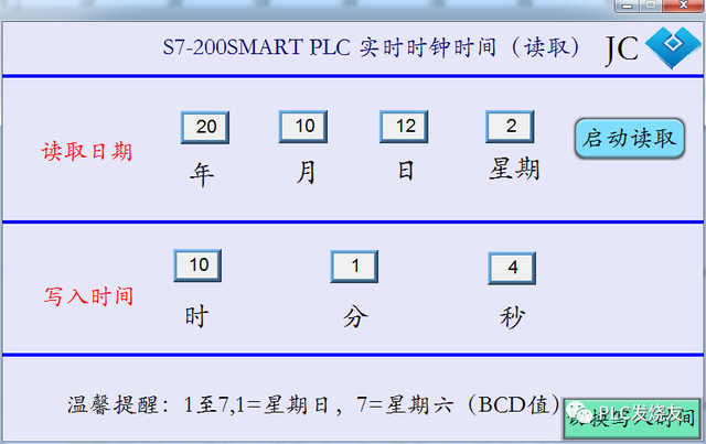 04在线模拟看一下效果 第一步:(点击启动读取按钮,现在读取PLC时间是:2020年10月12日星期一 10:01 04秒)