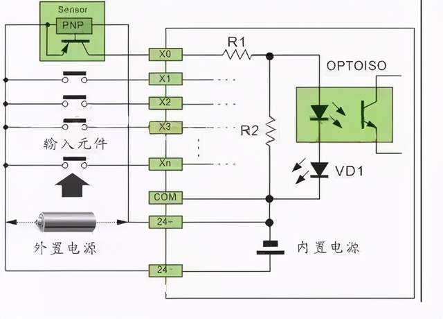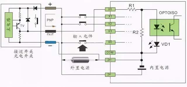 以上的情况只是针对,传感器是属于常开的状态下。 3、按电源配置类型 (1) 直流输入电路 如图1,直流输入电路要求外部输入信号的元件为无源的干接点或直流有源的无触点开关接点,当外部输入元件与电源正极导通,电流通过R1,光电耦合器内部LED,VD1(接口指示)到COM端形成回路,光电耦合器内部接收管接受外部元件导通的信号,传输到内部处理;这种由直流电提供电源的接口方式,叫直流输入电路; 直流电可以由PLC内部提供也可以外接直流电源提供给外部输入信号的元件。R2在电路中的作用是旁路光电耦合器内部LED的电流,保证光电耦合器LED不被两线制接近开关的静态泄漏电流导通。