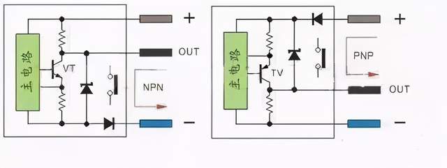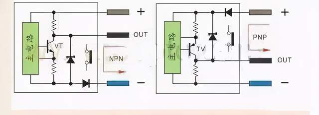 (3)S/S端子接法参考图5-图6以及图11-图12。 3、有源三线传感器(电感接近开关、电容接近开关、霍尔接近开关、光电开关等)直流有源三制线接近开关与光电开关输出管使用三极管输出,因此传感器分NPN和PNP输出,有的产品是四线制,有双NPN或双PNP,只是状态刚好相反,也有NPN和PNP结合的四线输出。 NPN型当传感器有检测信号VT导通,输出端OUT的电流流向负极,输出端OUT电位接近负极,通常说的高电平翻转成低电平。 PNP型当传感器有检测信号VT导通,正极的电流流向输出端OUT,输出端OUT电位接近正极,通常说的低电平翻转成高电平。 电路中三极管的发射极上的电阻为短路保护采样电阻2-3Ω不影响输出电流。三极管的集电极的电阻为上拉与下拉电阻,提供输出电位,方便电平接口的电路,另一种输出的三极管集电极开路输出不接上拉与下拉电阻。 简单说当三极管VT导通,相当与一个接点导通,如图13: