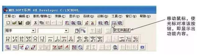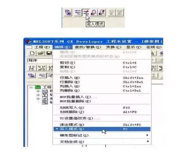 (5)梯形图编辑 使用功能键或工具按钮编辑梯形图,功能键和梯形图符号关系显示在工具栏的按钮上,编辑梯形图时,必须先设置在“写入模式” 。
