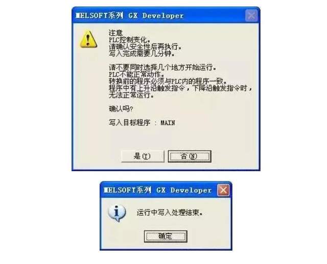 3、在线修改程序 (RUN中写入) 该功能在PLC处于RUN状态时,只将更改过的梯形块写入PLC。由于该功能不对整个程序进行传送,可在短时间内完成程序的写入,很适合现场调试的场合 。 选择变换菜单下的变换(运行中写入)或者Shift 键+ F4 键,出现以下对话框,点击[是](Y)按钮 。 运行中写入正常完成时,将显示以下对话框,点击[确定]按钮关闭画面 。