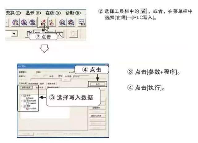 (7)将程序写入PLC: a.电脑与PLC连接