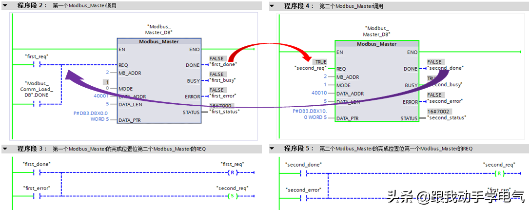 当Modbus_Master指令的“DATA_PTR”指向非优化访问的数据块时,该输入参数需要使用指针方式填写如P#DB3.DBX0.0 WORD 5 方式填写。 ④当Modbus RTU网络中存在多个modbus RTU从站或一个modbus RTU从站同时需要读操作和写操作,则需要调用多个Modbus_Master指令,Modbus_Master指令之间需要采用轮询方式调用。 下图14. 用于描述两个Modbus_Master指令轮询调用的方式。  图14.Modbus_Master轮询调用方式