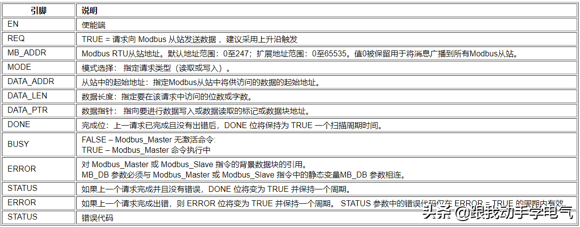Modbus_Master指令各参数意义如下表2所示:  表2 Modbus_Master指令参数意义