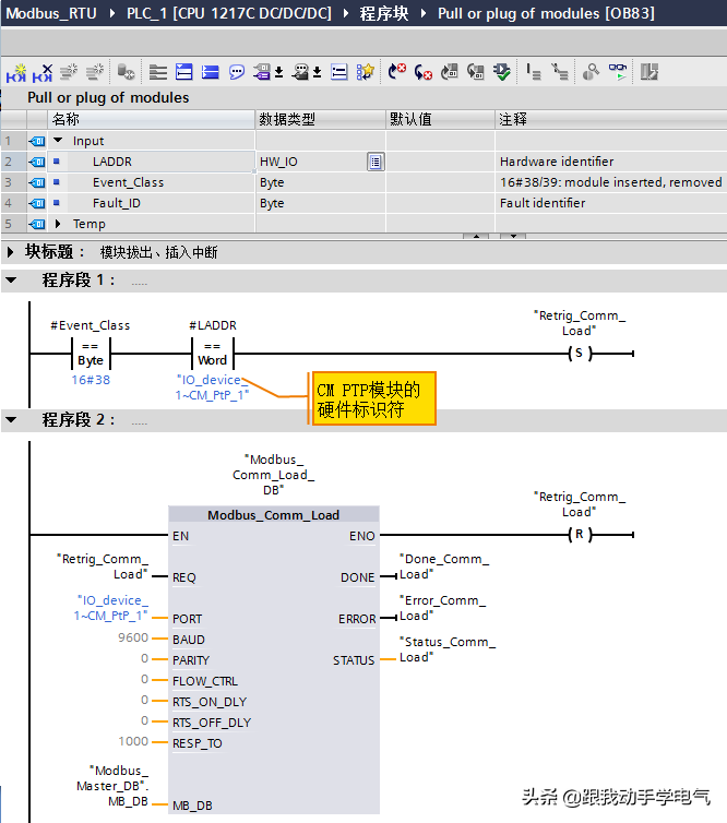 (2)、插入"Pull or plug of modules" 中断OB83。 本例中Modbus RTU主站模块安装在分布式IO站点上,因此程序中需要考虑分布式IO站点故障、CM PTP 模块插拔模块等故障。 分布式IO站点中插出、拔入模块时,操作系统都会调用一次OB83。通过OB83接口区的输入变量“16#Event_Class”判断故障的模块和类型:事件类型16#39表示模块被拔出,事件类型16#38表示模块被插入。 CM PTP 模块被重新插入的时候,需要在中断OB83中调用Modbus_Comm_Load 指令对通信模块进行重新组态,如图15. 所示。  图15. OB83中再次调用Modbus_Comm_Load 指令