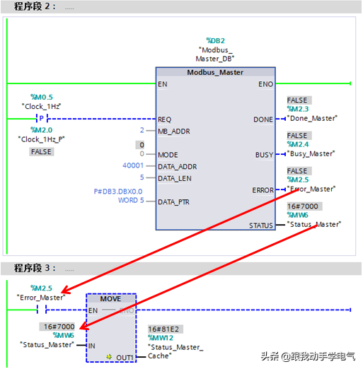 该静态变量“MODE”默认数据为0(RS232 全双工模式),需要根据CM1241 RS422/485模块实际组态修改该数值,本例中CM1241 RS422/485模块工作在RS485半双工模式需要将该数值修改为4,如何修改“MODE”静态变量见图12.所示。③Modbus_Slave指令的“MB_HOLD_REG”用于指向Modbus 保持寄存器的数据区域地址,该数据区域支持优化访问的数据块或者非优化(标准的)数据块,建议采用非优化访问的数据块。 本例中使用的数据区为非优化访问的数据块,固该输入参数需要使用指针方式填写如P#DB6.DBX0.0 WORD 100 方式填写。 如何在数据块的属性中取消“优化的块访问”,见图13. 所示。 将程序下载到PLC中,并使用Profibus DP通信电缆将CM1241 RS422/485与CM PTP串口模块连接起来,即可测试Modbus RTU通信了。 3.常见问题FAQ 1. 新版本 Modbus RTU指令的使用是否存在些限制条件? 新版本 Modbus RTU指令通过CM1241通信模块或CB1241通信板进行Modbus RTU通信时,需要满足如下条件: a. S7-1200 CPU 的固件版本不能低于V4.1; b. CM1241通信模块或CB1241通信板的固件不能低于V2.1。 S7-1200 V4.0 固件CPU可以通过固件更新到V4.1版本,V2.0固件的CM1241通信模块也可以通过固件更新的方式更新到V2.1版本。 相关固件更新的方法请参考 S7-1200 固件更新 。 2 .Modbus_Comm_Load指令背景数据块中的静态变量“MODE”的作用是什么?为什么一般项目中,都需要对该变量进行修改? 新版本的 Modbus RTU指令扩展了Modbus RTU的功能,该指令除了支持CM1241通信模块、CB1241通信板还支持 PROFINET 或 PROFIBUS 分布式 I/O 机架上的PTP通信模块实现Modbus RTU通信。 而分布式 I/O 机架上的PTP通信模块可以支持多种工作模式,以ET200SP CM PtP模块(订货号:6ES7137-6AA00-0BA0)为例,其可以支持RS232、RS485以及RS422等多种工作模式。 Modbus_Comm_Load指令背景数据块中的静态变量“MODE”则用于定义PTP模块的工作模式。 “MODE”的默认数值为0,代表“全双工 (RS232)”工作模式,实际项目组态中则需要根据实际工作模式对该变量进行修改。 3. Modbus_Comm_Load指令能否在启动组织块OB100中调用? Modbus_Comm_Load指令不建议在启动组织块OB100中调用。新版本的Modbus RTU指令扩展了Modbus RTU的功能,该指令支持 PROFINET 或 PROFIBUS 分布式 I/O 机架上的PtP通信模块实现Modbus RTU通信。 操作系统需要调用读取数据记录和写入数据记录等指令来实现与分布式I/O机架上PtP模块的Modbus RTU通信。读取数据记录和写入数据记录指令为异步读写指令,指令的执行需要N个扫描周期,所以不建议Modbus_Comm_Load指令在启动组织块OB100中调用。 4. 如何查询Modbus RTU通信错误时的错误代码? 以Modbus_Master指令为例,当通信出现错误时,Modbus_Master指令的“ERROR”输出位将变为 TRUE 但是只保持一个扫描周期,所以通过TIA 软件程序监控时无法查询到错误。 Modbus_Master指令“STATUS” 参数中的错误代码仅在“ERROR” = TRUE 的扫描周期内有效,为了获取了Modbus RTU通信错误的错误代码我们可以采用下图19. 方式编程。  图19. 获取STATUS
