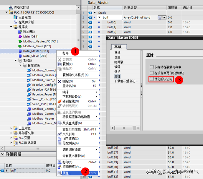 ③Modbus_Master指令的“DATA_PTR”参数用于指向要进行数据写入或数据读取的数据区域地址,该数据区域支持优化访问的数据块或者非优化(标准的)数据块,建议采用非优化访问的数据块。 本例中使用的数据区为非优化访问的数据块,在数据块的属性中取消“优化的块访问”即可将数据块修改为非优化访问的数据块(鼠标右键数据块,选择“属性”,取消“优化的块访问”),如图13. 所示。  图13. 设置数据块为非优化访问