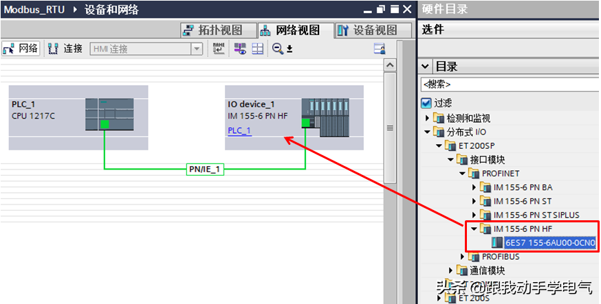 b.组态ET200 SP CM PtP 模块 (1)、插入一个ET200SP分布式站点。 打开网络视图并拖入一个ET200SP站点,并将其分配给相应的IO 控制器(本例CPU1217C 为 IO 控制器),如图8.所示。  图8. 插入ET200SP站点