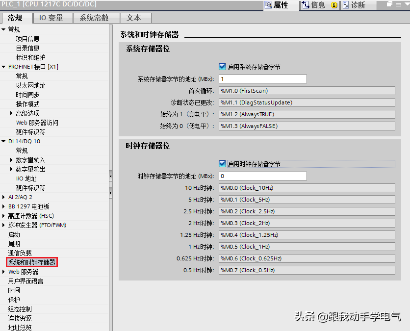 另外,S7-1200 还提供了系统和时钟存储器功能,为了便于后续指令,建议使能该功能。在CPU “属性”→“常规”→“系统和时钟存储器”使能系统和时钟存储器功能,如图7. 所示。  图7. 系统和时钟存储器功能