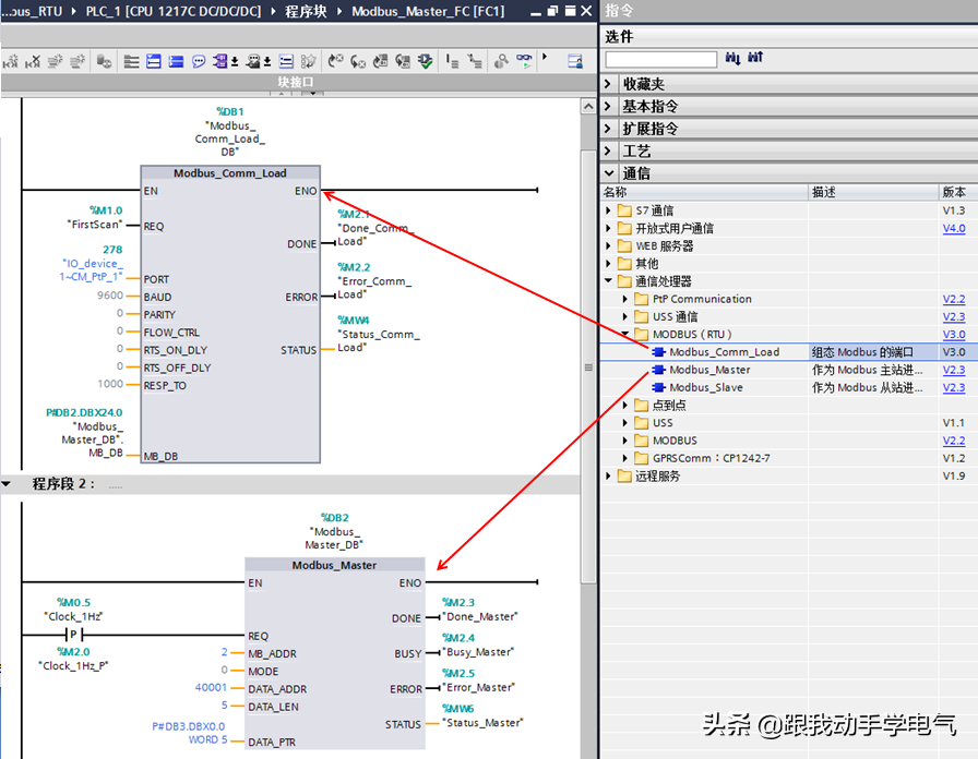 最后需要在“硬件标识符”里确认一下CM PTP 模块硬件标识符,该参数在程序编程中会被使用。 2.软件编程 a.Modbus RTU 主站编程 Modbus RTU主站编程需要调用Modbus_Comm_Load 指令和Modbus_Master 指令,其中Modbus_Comm_Load 指令通过 Modbus RTU 协议对通信模块进行组态,Modbus_Master 指令可通过由 Modbus_Comm_Load 指令组态的端口作为 Modbus 主站进行通信, Modbus_Comm_Load 指令的 MB_DB 参数必须连接到 Modbus_Master 指令的(静态)MB_DB 参数。 本例中分布式机架ET200SP 中 CM PTP 模块作为Modbus RTU主站,其相关编程步骤如下: (1)、OB1 中插入一个FC函数,并在函数中拖入Modbus_Comm_Load 指令和Modbus_Master 指令。如图11. 所示  图11. 拖入Modbus RTU 主站指令