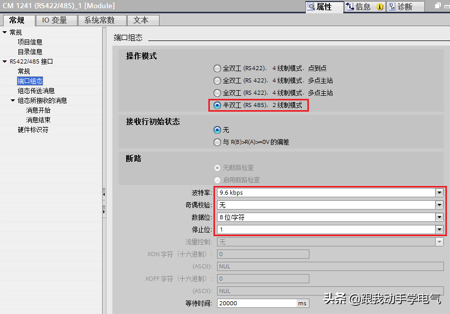 注意: 固件版本>=V2.1 的CM 1241 RS422/485模块,才支持新版本Modbus RTU指令。 接下来,在“设备视图”中用鼠标选中CM1241(RS422/485)模块,在“属性”→“端口组态”中配置此模块硬件接口参数, 本例以传输率=9.6Kbps,奇偶校验=无奇偶校验,数据位=8位字符,停止位=1为例。如CM 1241 端口组态设置如下图5.所示:  图5. CM1241 RS422/485 模块端口组态