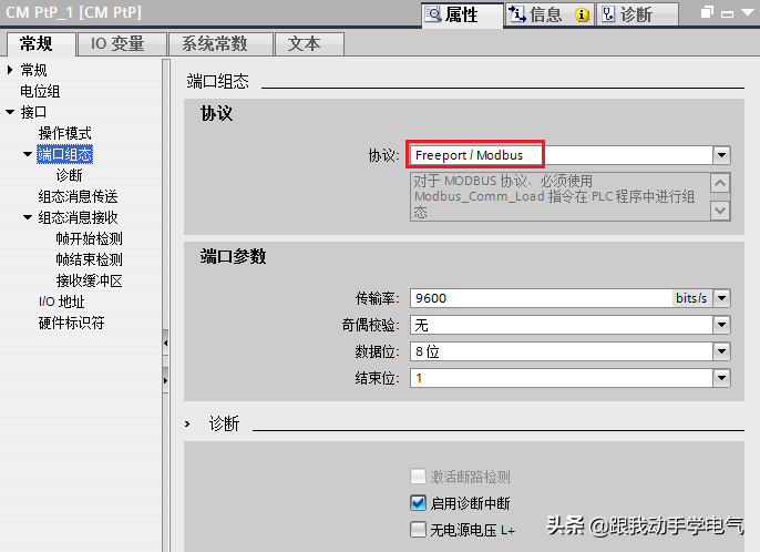接下来,在“属性”→“常规”→“接口”→“端口组态”中配置此模块端口组态参数, 本例设定"协议":"Freeport/Modbus";"端口参数"设置:传输率=9.6Kbps,奇偶校验=无奇偶校验,数据位=8位字符,停止位=1为例。端口组态设置如下图10.所示:  图10. CM PTP 端口组态