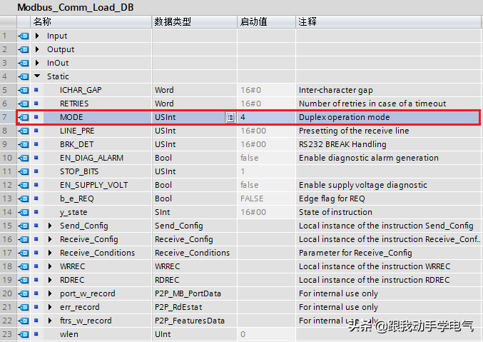 该静态变量“MODE”默认数据为0(RS232 全双工模式),需要根据CM PTP模块实际组态修改该数值,本例中CM PTP模块工作在RS485半双工模式需要将该数值修改为4,如图12.所示。  图12. Modbus_Comm_Load背景数据块静态变量“MODE”修改为4