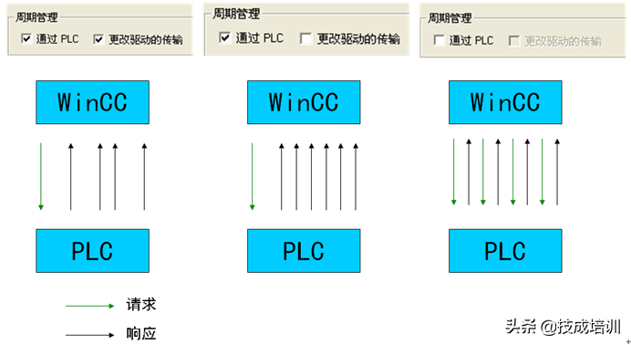 在通道单元系统参数中,周期管理中设置WinCC与PLC的通讯方式,如图2-5,“通过PLC”选项表示过程值是否由PLC主动返回;“更改驱动的传输”表示过程值是有变化时返回还是周期地返回。周期性读取服务的数目取决于S7-PLC中可用的资源。对于S7-300,最多有4个周期性服务可用,对于S7-416或417,则最多为32个。该数目适用于与PLC进行通讯的所有成员,也就是说,如果有多个WinCC系统与S7-PLC进行通讯,则它们必须共享可用的资源。如果超过资源的最大数目,则超出的周期性读取服务访问将被拒绝。于是WinCC不得不使用非周期读取请求来请求该数据。