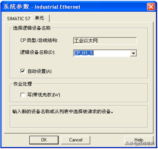在系统参数的“单元”页,WinCC和自动化系统之间的通讯通过逻辑设备名称执行。如图2-7。设备名称是在安装通讯卡时分配的,并且是单元特定的条目。如果只安装了该通讯类型的一个通讯处理器,则激活复选框“自动设置”,运行系统启动时将自动设置设备名称。