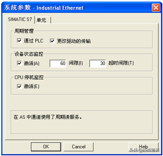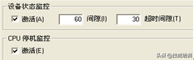 如图2-6,间隙:为了检测PLC的状态,WinCC以此时间间隔不停发包给PLC以检测通讯状态,单位为秒。超时间隙:PLC在此时间内若无响应,WinCC将报通讯错误。CPU停机监控:如果CPU停机,连接被中断。