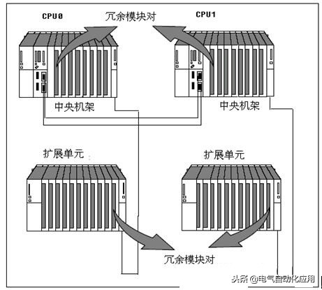 说明:1.若启动成功,主CPU(CPU0)将切换到单模式,单独执行用户程序。在向LINK-UP 系统模式过渡期间,无法通过“监视”选项打开任何块,且不能激活任何变量表。 2. 若备用CPU (CPU1)请求LINK-UP,主CPU和备用CPU将比较它们的用户程序。如果发现用户程序之间存在差异,主CPU会更新备用CPU的用户程序。 3. 链接成功后,开始更新,主CPU会更新备用CPU的动态数据(包括输入、输出、定时器、计数器、位存储器和数据块)。更新后,两个CPU的存储器将具有相同的内容。 4. 更新后,主CPU和备用CPU都处于RUN模式,两个CPU彼此同步地处理用户程序。 5.当系统处于单模式、链接、更新、冗余状态时,主CPU处于RUN模式,并以单模式执行用户程序。 6.在冗余系统模式下运行时,主CPU和备用CPU始终处于RUN模式。两个CPU同步执行用户程序,并互相执行检查。在该模式下,不能使用断点测试用户程序,且互连的模块必须是一对相同的模块。 7. HOLD模式具有特殊的作用,只能用于测试目的,处于该模式的S7-400H CPU的行为与标准S7-400 CPU的行为一致,容错CPU不能进行链接和更新操作,备用CPU保持STOP模式并输出一条诊断消息。 8. 只能从冗余系统模式进入ERROR-SEARCH模式,当系统处于冗余状态,自检例程会比较主CPU和备用CPU,并在发现差异时报告错误,故障排除期间,退出冗余系统模式,另一个CPU成为主站并在单模式下继续工作。 I/O的控制权问题:在任何给定时刻,容错系统都只使用从站中的一个接口。激活接口由相应IM153-2或IM157上的ACT LED指示。在S7–400H中使用I/O通过当前活动接口(IM153-2或IM157)的路径称为主动通道,通过另一接口的路径称为被动通道。DP周期始终在两个通道上都处于活动状态。但只有主动通道的输入和输出值才会在用户程序中进行处理或输出到I/O。 特点:1.平稳的主从切换,切换时间<100ms,切换期间输出保持,信息或者报警/中断不会丢失,实现无扰切换 2.自动事件同步,保证所有的信息,报警或中断不丢失 3.下载时,程序自动复制到两个CPU中 4.在线维修,在运行状态下,可随意换下所有部件,维修后CPU自动进入冗余状态 5.所有冗余功能由CPU处理不需要用户处理 6.与主控制器的距离可高达10km I/O 1.中央和扩展设备中的I/O冗余 信号模板成对安装在 CPU 0 和 CPU 1 子系统中,如下图所示: