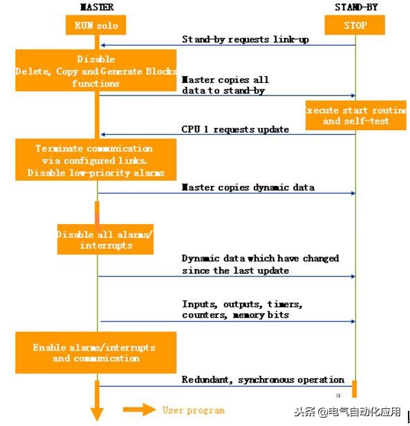 1. S7-400H系统组件: 1个UR2–H机架(机架UR1、UR2) 2个H–CPU 4个同步模块(用于链接两个CPU,安装在CPU中并通过光缆互连) 2根光缆 2.一个带有源背板总线的ET 200M分布式I/O设备,其配有 2个IM153–2 1个数字量输入模块SM321 DI 16 x DC24V 1个数字量输出模块SM322 DO 16 x DC24V 3.所有必需的附件,例如,PROFIBUS 电缆 说明:1.机架号通过CPU背面的开关来设置(默认为0),设置不正确会影响在线通信,CPU也可能无法正常启动。 2. 务必将CPU的两个上游同步模块与两个下游同步模块互连,敷设光纤电缆。在接通电源或系统前,务必将光纤电缆连接到这两个CPU,否则两个CPU都会作为主CPU来执行用户程序。 3. 将编程设备连接到第一个容错CPU(CPU0),该CPU将成为S7-400H的主CPU。 4. 上电后执行高质量RAM测试,该过程大约需要10分钟,期间不能访问CPU,且STOP LED灯会一直闪烁,若使用备用电池,以后通电时将不再执行此测试。 主从站分配:一般来说,两个CPU具有相同的权限,因此任何一个CPU都可作为主CPU或备用CPU。 1. 首次接通S7-400H的电源时,先启动的CPU进入主站模式,而伙伴CPU进入备用站模式。 2. 两个CPU同时上电时,将保持预设的主站/备用站分配。 3. 以下情况,主站/备用站分配将发生更改:备用CPU在主CPU之前启动(时间间隔至少3 秒);在冗余系统模式下,主CPU发生故障或进入STOP模式;在ERROR-SEARCH模式下并未发现错误。 同步: 主CPU与备用CPU通过光纤电缆链接,并通过此链接保持事件同步程序执行。 在下列情况下,同步主从CPU:直接访问I/O;发生中断;更新用户定时器;通信功能修改了数据。西门子采用事件同步,同步周期比定时同步稍短。 自动CPU同步的链接备份过程如下图所示: