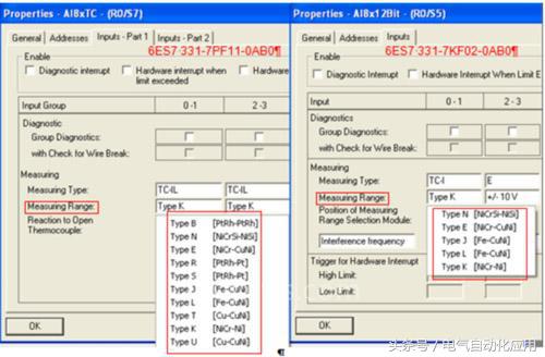 对于S7-300的模板,组态如图10和11所示,只需要选择测量类型和测量范围(分度类型),补偿方式包含在测量类型中。比如: 参比接点固定温度补偿方式,测量类型选择 TC-L00C(参比接点温度固定为0℃) 或 TC-L50C(参比接点温度固定为50℃),再选择分度类型,组态就完成。