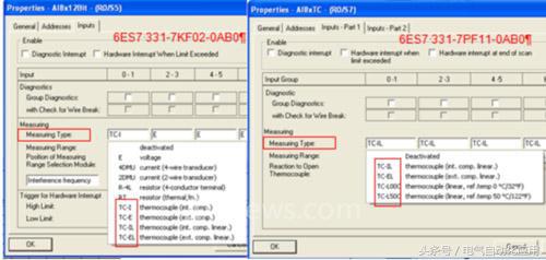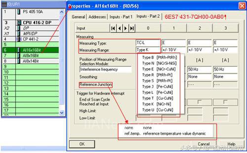 首先要在硬件组态选择与外部补偿接线一致的measuring type(测量类型),measuring range(测量范围),reference junction(参比接点类型)和reference temperature(参比接点温度)的参数,如下各图所示。