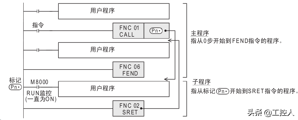 子程序,在顺控程序中,对想要共同处理的程序进行调用的指令,可以减少程序的步数,更加有效地 设计程序。当指令输入为ON时,执行CALL指令,向标记指针Pn跳转,接着,执行标记Pn处的子程序,执行SERT指令后返回CALL指令的下一步,在主程序的最后用FEND指令编程。  子程序
