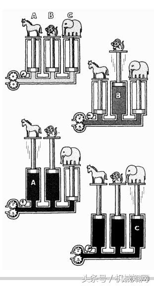 平行连接管路中的压力如果我们将三个不同负载以平行方式与下图所示的同一液压系统连接,油将会找到最小阻力通道,因为油缸 B 需要的压力最低,也就是说最轻负载将首先得到提升,提升最轻负载时,压力将上升到足够大小以提升下一次轻负载;油缸 A 到达其行程终端时,压力上升以提升最重负载。因此油缸 C 将在最后被提升。
