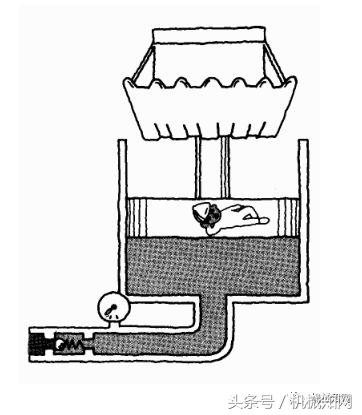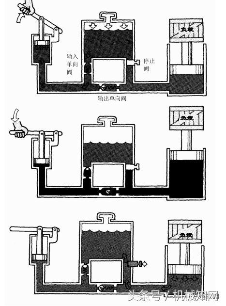 油 箱:贮存油 连接管路:连接系统的各个部件让我们看一下两种极为简易的液压系统。 例子 1,液压千斤顶这里你看到的是一台液压千斤顶。把力作用于杠杆时,手动泵使油进入油缸。油压作用在活塞上向上推动,并提升负载。液压千斤顶很像帕斯卡液压杠杆。 这里的油箱加了油。增加了单向阀,使油保持在油箱中,使油缸在泵的行程转换中位置不动。 上图中,负载压力使输出单向阀处于关闭状态。泵手柄向上拉动时,输入单向阀打开,允许油箱中的油注入泵室。 接着,向下推动泵手柄。油压关闭输入单向阀,而打开输出单向阀。这一运动过程中,有较多的油进入油缸,推动活塞向上运动。 下图显示的是打开停止阀,它连接油箱和油缸,这样油可以流回油箱,使活塞降下。
