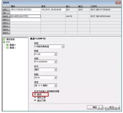 (2)、模拟量模块上通道断线或是输入值超量程。 模拟量模块上通道断线或是输入值超量程,除了会引起模块的DIAG指示灯以红色闪烁,断线或是超量程的通道的指示灯也以红色闪烁,以提示用户存在故障通道。 以RTD或TC模块为例,如果RTD或TC模块选择了断线报警,如图2.39启动断线报警所示。则模块会检测每个通道的断线情况。默认情况下,该选项是没有被激活的。RTD或TC模块对于没有使用的通道的处理方法如下: ①、RTD模块:将一个100Ohm的电阻按照与已用通道相同的接线方式连接到空的通道;或者将已经接好的那一路热电阻的所有引线,一一对应连接到空的通道上。 ②、TC模块:短接未使用的通道,或者并联到旁边的实际接线通道上。 图2.39 启动断线报警 如果不是通道断线引起的报警,就是输入值超量程了。默认情况下,RTD和TC模块的通道输入值超上下限报警是激活的。发生了该报警,用户需要判断引起通道值超量程的原因:是信号问题还是模块硬件的问题。  图4.模拟量断线报警