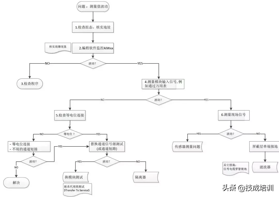 模拟量输入值的滤波过程会产生稳定的模拟信号,通常过滤对于在处理变化缓慢的信号时非常有用,例如温度测量。可以为滤波分为4个级别(无、弱、中、强)。可组态模块在组态的周期数内平滑模拟量输入信号,从而将一个平均值传送给程序逻辑,滤波级别越高,经滤波处理的模拟值就越稳定,但无法反应快速变化的实际信号。 S7-200 SMART模拟量输入模块接收到测量值波动时的检测方法和步骤 当 S7-200 SMART模拟量输入模块接收到测量值波动时,可通过如下图的步骤进行检查:  图7. 测量值波动时的检测方法