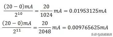 3、S7-200 SMART RTD和TC模块如何得到实际温度值? 把S7-200 SMART EM RTD和TC模块的通道值除以10就是实际的温度值。由于RTD和TC模块的通道值是整数值,需要把整数值转换成浮点数才能在计算后得到带有小数位的温度值。 4、模拟量模块分辨率和转换精度的区别? 分辨率是A/D模拟量转换芯片的转换精度,即用多少位的数值来表示模拟量。以下举例说明10位分辨率和11位分辨率的区别。S7-200 SMART CPU模拟量0~20mA的通道值范围为0~27648。如果分辨率为10位,则表示当外部电流信号的变化大于0.01953125mA时,模拟量A/D转换芯片才认为外部信号有变化。如果分辨率为11位,则表示当外部电流信号的变化大于0.009765625mA时,模拟量A/D转换芯片即认为外部信号有变化。  图2.模拟量分辨