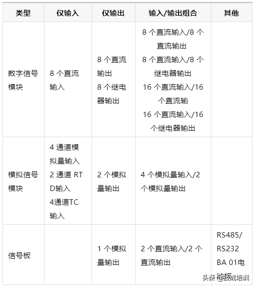 注意: A、上图中所提到的等电位连接以及不用通道短接请参考本页图5。 B、屏蔽层单端接地:是在屏蔽电缆的一端将金属屏蔽层直接接地,另一端不接地或通过保护接地。 在屏蔽层单端接地情况下,非接地端的金属屏蔽层对地之间有感应电压存在,感应电压与电缆的长度成正比,但屏蔽层无电势环流通过。单端接地就是利用抑制电势电位差达到消除电磁干扰的目的。 三、S7-200 SMART 扩展模块: S7-200 SMART 系列包括各种扩展模块和信号板。 可以将这些扩展模块与标准 CPU 型号(SR20\ST20、SR30\ST30、SR40\ST40、或 SR60\ST60)一起使用,给 CPU增加附加功能。 下表列出了当前提供的扩展模块。 注意:  表1.SMART 扩展模块基本信息
