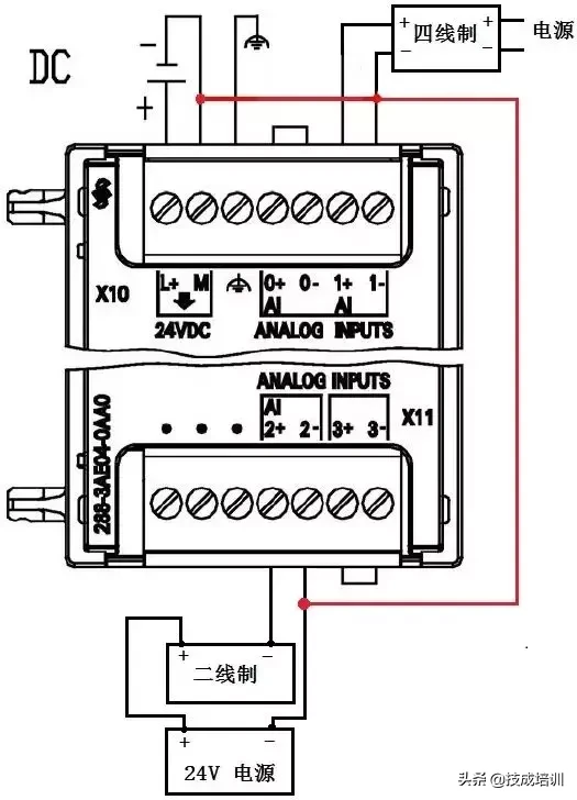 模拟量电流、电压信号根据模拟量仪表或设备线缆个数分成四线制、三线制、两线制三种类型,不同类型的信号其接线方式不同。 四线制信号指的是模拟量仪表或设备上信号线和电源线加起来有4根线。仪表或设备有单独的供电电源,除了两个电源线还有两个信号线。四线制信号的接线方式如下图2模拟量电压/电流四线制接线所示。  图2、模拟量电压/电流四线制接线