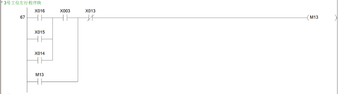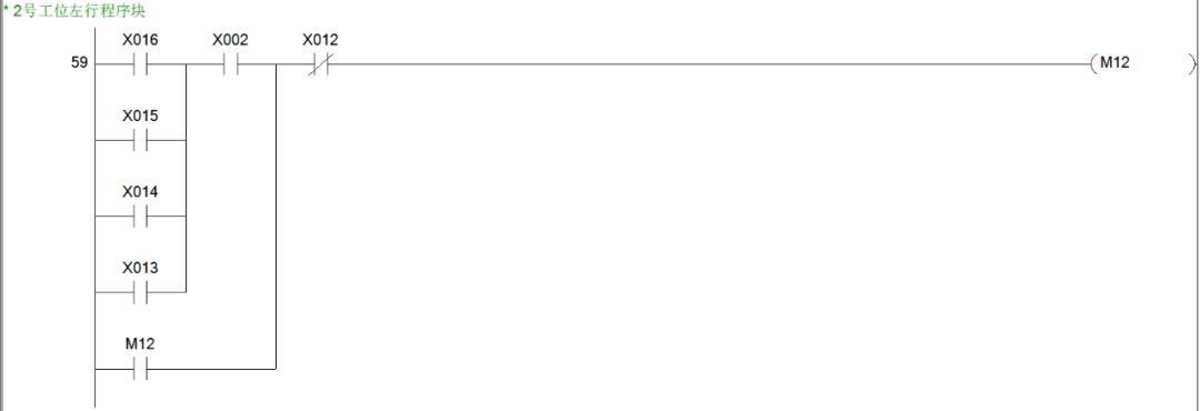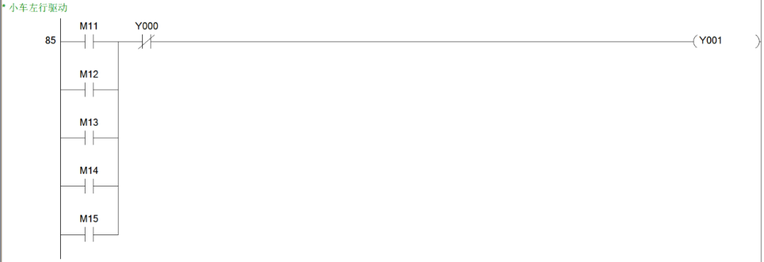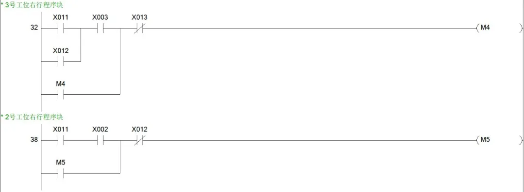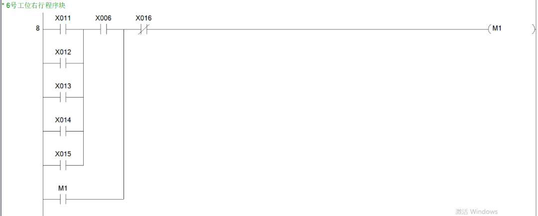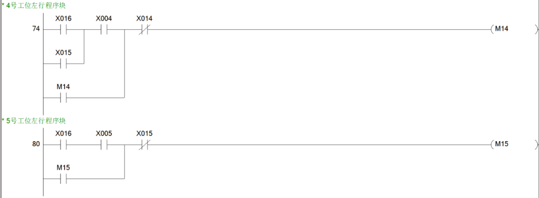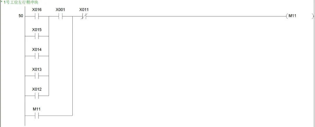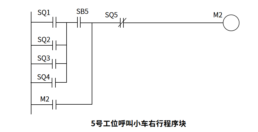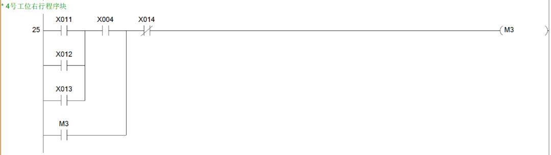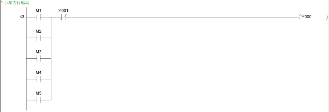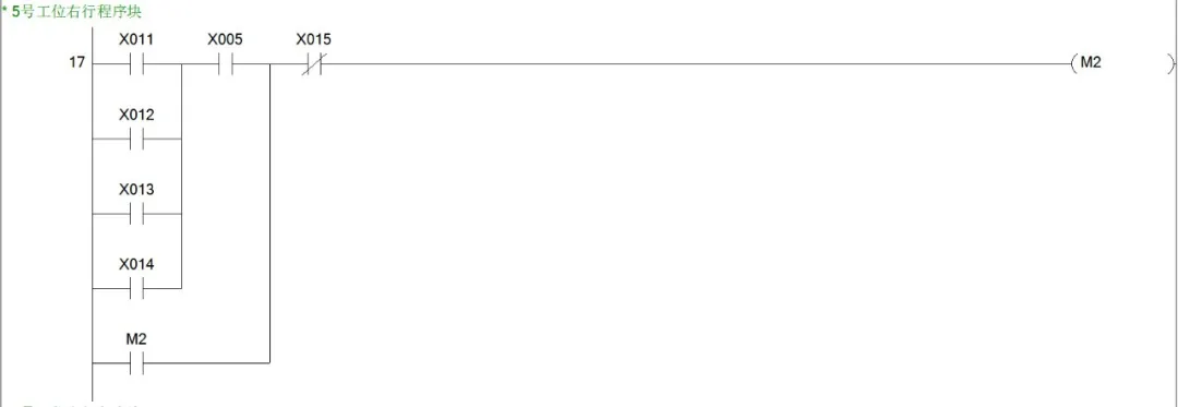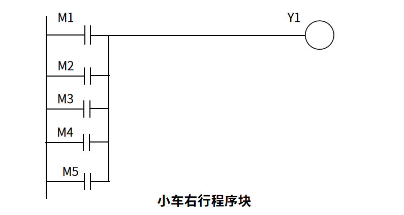 同样是思路我们可以很快得出2、3、4号工位呼叫小车右行的程序块。综上,小车右行的程序块就有5个,也就说,从M1~M5这5个辅助控制继电器线圈都是用于控制小车的右行。小车右行的输出线圈为Y1,所以我们可以写出小车右行的程序块如下图。