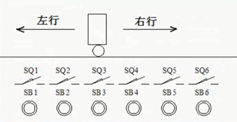 知道了原则和步骤,我们接着来看一个六工位料车控制实例,如下图所示。电动小车供六个加工点使用,电动车在六个工位之间运行,每个工位均有一个到位行程开关和呼叫按钮。