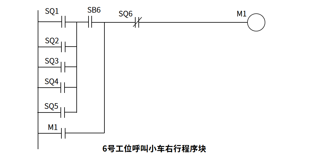 因为6号工位在最右边,所以它没有呼叫小车左行的控制。同样的,1号工位在最左边,所以1号工位也只能呼叫小车左行,但我们现在先不讨论小车左行的控制。