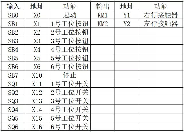 小车左行的运行分析也和上文类似,我们可以先从1号工位开始分析,在这里我就不再赘述。另外,当小车左行的过程中,它是不可能右行的,也就是电机不可能同时正反转,所以有必要给小车的右行程序块和左行程序块加一个互锁控制。 3、I/O地址分配表