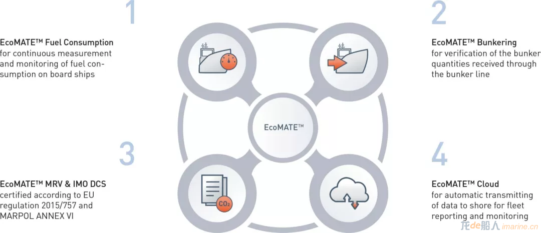 EcoMATE™符合欧盟关于监测,报告和验证二氧化碳排放的海上运输法规2015/757(EU MRV),以及全球国际海事组织的船舶燃油消耗数据收集系统(IMO DCS),两者皆旨在减少航运产生的温室气体排放。 欧盟MRV规则MRV代表Monitoring, Reporting and Verification,即监测、报告和验证。欧盟针对航运业温室气体排放的MRV法规已于2015年7月1日生效,所有大于5000总吨、靠泊欧盟港口的船舶都需要满足MRV法规的要求- 即必须于2017年8月31日之前准备一份二氧化碳排放的监测计划提交给第三方认可机构如DNV GL验证并上报欧盟相关机构。自2018年1月1日起至12月31日止是船舶排放二氧化碳数据收集的第一个报告期。该报告经由第三方认可机构如DNV GL验证以后需于2019年4月30日之前上报欧盟,欧盟将于2019年6月30日发布排放报告。 EcoMATE™包括四个模块:燃油消耗监测,燃油加注验证,EU MRV和IMO DCS排放报告以及云模块。燃油消耗模块用于连续测量和监测船上消耗的所有类型的燃油。系统从安装在发动机的供油和回油管线中的(科里奥利质量)流量计上读取数据,该数据显示并保存在控制室内,系统可以用该数据来监测燃油的当前和总使用量,比如可以用来验证能效。
