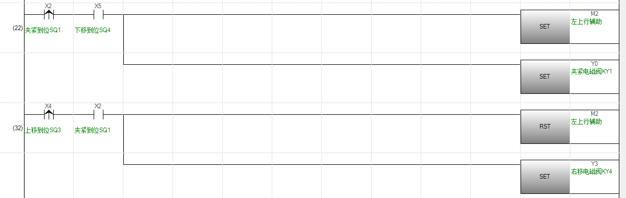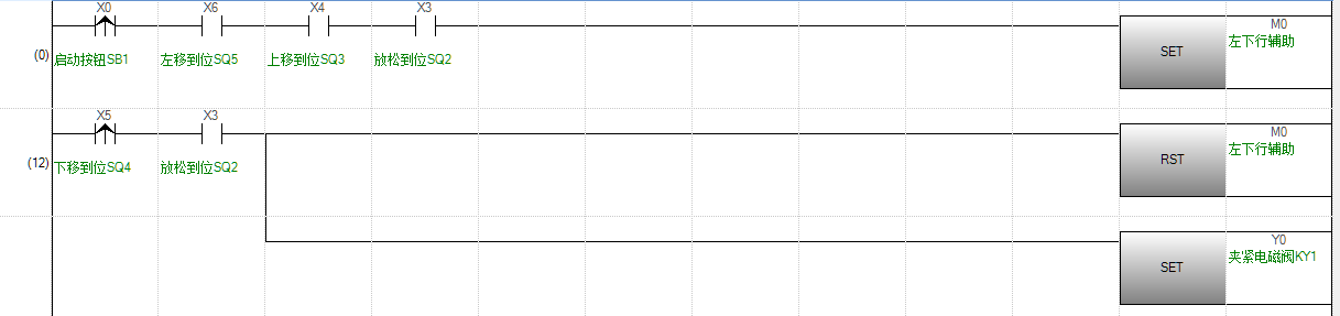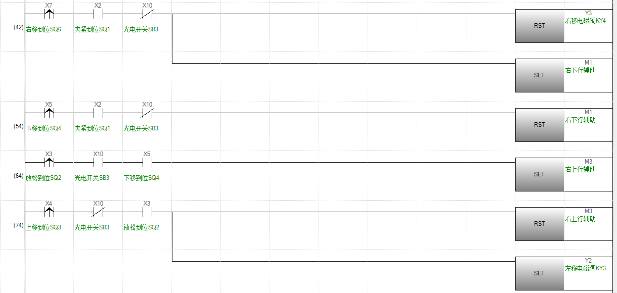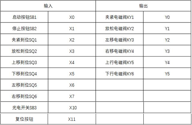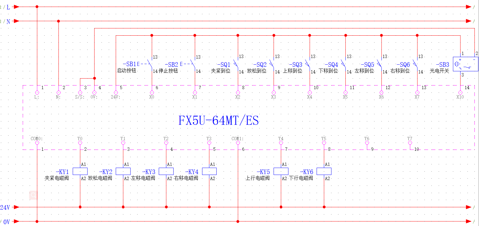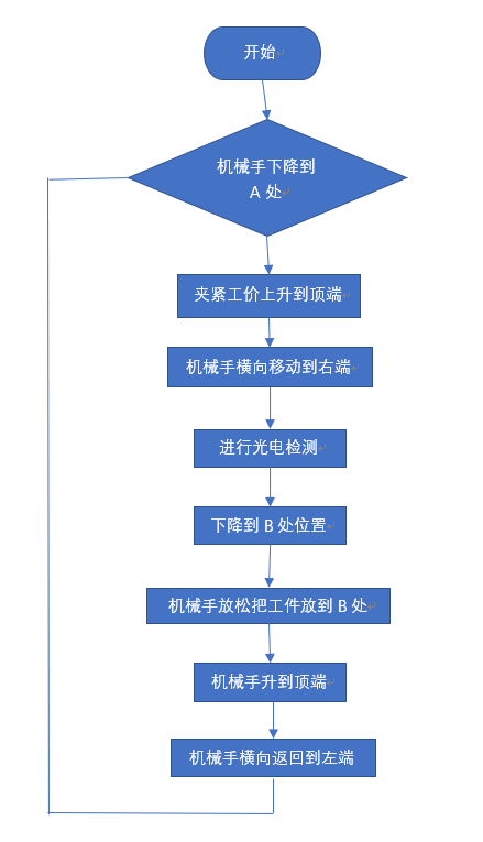 控制要求1、机械手“取与放”搬运系统,定义原点为左上方所达到的极限位置,其左限位开关闭合,上限位开关闭合,机械手处于放松状态。 2、搬运过程是机械手把工件从A处搬到B处。 3、上升和下降,左移和右移均由电磁阀驱动气缸来实现。 4、当工件处于B处上方准备下放时,为确保安全,用光电开关检测B处有无工件。只有在B处无工件时才能发出下放信号。 5、机械手工作过程:启动机械手下降到A处位置一夹紧工件一夹住工件上升到顶端一机械手横向移动到右端,进行光电检测一下降到B处位置一机械手放松,把工件放到B处一机械手上升到顶端一机械手横向移动返回到左端原点处。 设计要求3、按工艺要求画出控制流程图: 4、写出梯形图程序; 5、用三菱系列PLC编程; 6、实物接线。 流程图