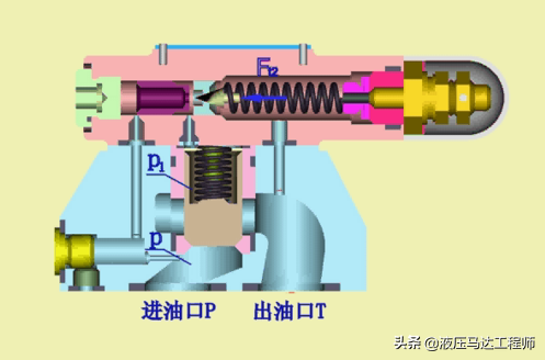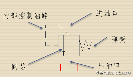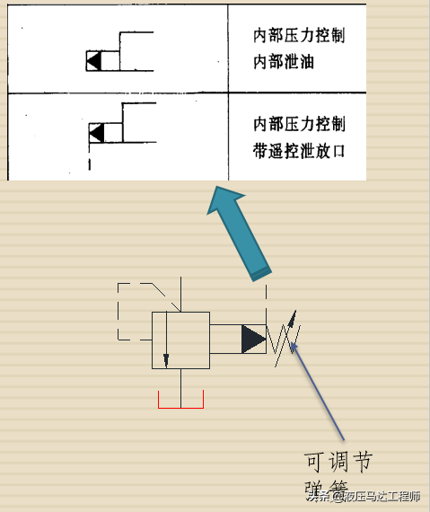 阀的符号左侧和直动式溢流阀一样,右边多了一个黑色三角形和一个斜箭头,还有一个虚线。斜箭头表示弹簧力量可调,虚线是远程控制油路遥控口,或者是内部泄油的泄方口。黑色三角形代表了油流动的方向。三角形顶点朝外说明油的流动方向是由阀的内部向外流动的。