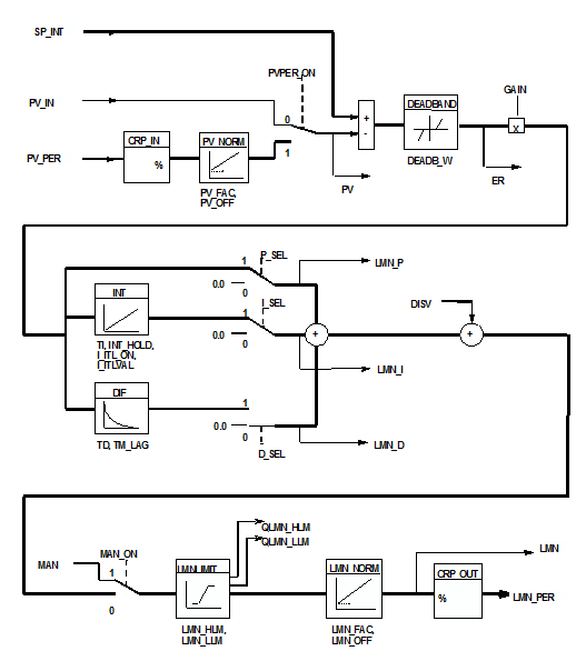 PV_PER=0时,对应的实际压力为PV_OFF,即0MPa; PV_PER=27648时,对应的实际压力为PV_FAC,即1MPa; PV=PV_PER/27648*(PV_FAC – PV_OFF),本例中,PV=PV_PER/27648; - · ER为给定值SP_INT和实际值PV的偏差,PID即是基于它进行调节的;