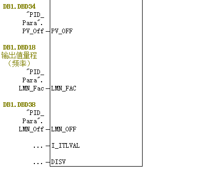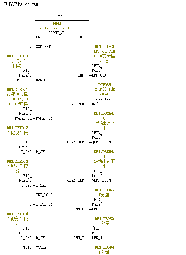 FB41中还有其他参数,本文仅对PID控制做简单介绍,上述几个参数是必须了,将其定义在DB1中,如图4所示。然后在OB35中,调用FB41,并将DB1中的数据一一对应的填入相应的引脚,即完成了PID控制的基础工作,如图5-7所示。  图4 FB41关键参数定义