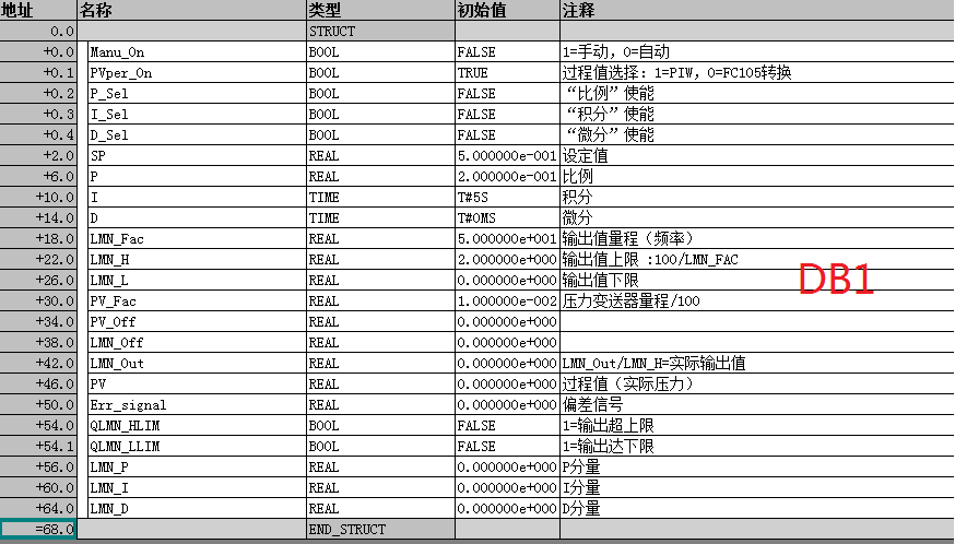 · 当PVPER_ON=0时,PV_IN端的值为实际值,该值通常有FC105转换而来; · 当PVPER_ON=1时,PV_PER端的值为实际的压力值,该值来自AI模块,为压力传感器的反馈值; 本例中,我们以PVPER_ON=1时,来说明。即:1==>"PVPER_ON"、PIW272==>"PV_PER" - · PV_FAC、PV_OFF对应压力的范围,即:1==>"PV_FAC"、0==>"PV_OFF"。