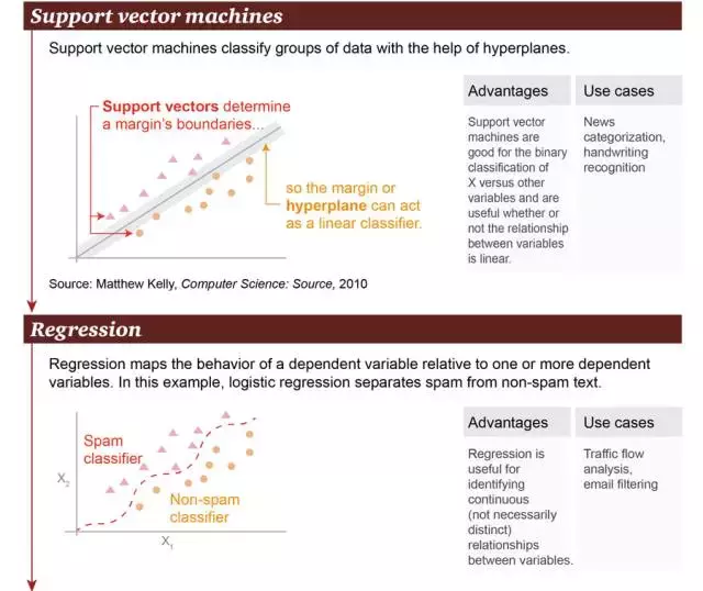 3. 这些流派有望合作,并将各自的方法融合到一起 2010 年代末期 2020 年代+ 2040 年代+ 三、机器学习的算法 你应该使用哪种机器学习算法?这在很大程度上依赖于可用数据的性质和数量以及每一个特定用例中你的训练目标。不要使用最复杂的算法,除非其结果值得付出昂贵的开销和资源。这里给出了一些最常见的算法,按使用简单程度排序。更多内容可参阅机器之心的文章《机器学习算法集锦:从贝叶斯到深度学习及各自优缺点》和《经验之谈:如何为你的机器学习问题选择合适的算法?》 1. 决策树(Decision Tree):在进行逐步应答过程中,典型的决策树分析会使用分层变量或决策节点,例如,可将一个给定用户分类成信用可靠或不可靠。 2. 支持向量机(Support Vector Machine):基于超平面(hyperplane),支持向量机可以对数据群进行分类。 3. 回归(Regression):回归可以勾画出因变量与一个或多个因变量之间的状态关系。在这个例子中,将垃圾邮件和非垃圾邮件进行了区分。 4. 朴素贝叶斯分类(Naive Bayes Classification):朴素贝叶斯分类器用于计算可能条件的分支概率。每个独立的特征都是「朴素」或条件独立的,因此它们不会影响别的对象。例如,在一个装有共 5 个黄色和红色小球的罐子里,连续拿到两个黄色小球的概率是多少?从图中最上方分支可见,前后抓取两个黄色小球的概率为 1/10。朴素贝叶斯分类器可以计算多个特征的联合条件概率。 5. 隐马尔可夫模型(Hidden Markov model):显马尔可夫过程是完全确定性的——一个给定的状态经常会伴随另一个状态。交通信号灯就是一个例子。相反,隐马尔可夫模型通过分析可见数据来计算隐藏状态的发生。随后,借助隐藏状态分析,隐马尔可夫模型可以估计可能的未来观察模式。在本例中,高或低气压的概率(这是隐藏状态)可用于预测晴天、雨天、多云天的概率。 6. 随机森林(Random forest):随机森林算法通过使用多个带有随机选取的数据子集的树(tree)改善了决策树的精确性。本例在基因表达层面上考察了大量与乳腺癌复发相关的基因,并计算出复发风险。 7. 循环神经网络(Recurrent neural network):在任意神经网络中,每个神经元都通过 1 个或多个隐藏层来将很多输入转换成单个输出。循环神经网络(RNN)会将值进一步逐层传递,让逐层学习成为可能。换句话说,RNN 存在某种形式的记忆,允许先前的输出去影响后面的输入。 8. 长短期记忆(Long short-term memory,LSTM)与门控循环单元神经网络(gated recurrent unit nerual network):早期的 RNN 形式是会存在损耗的。尽管这些早期循环神经网络只允许留存少量的早期信息,新近的长短期记忆(LSTM)与门控循环单元(GRU)神经网络都有长期与短期的记忆。换句话说,这些新近的 RNN 拥有更好的控制记忆的能力,允许保留早先的值或是当有必要处理很多系列步骤时重置这些值,这避免了「梯度衰减」或逐层传递的值的最终 degradation。LSTM 与 GRU 网络使得我们可以使用被称为「门(gate)」的记忆模块或结构来控制记忆,这种门可以在合适的时候传递或重置值。 9. 卷积神经网络(convolutional neural network):卷积是指来自后续层的权重的融合,可用于标记输出层。