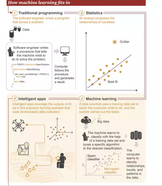 一、机器学习概览 1. 什么是机器学习? 机器通过分析大量数据来进行学习。比如说,不需要通过编程来识别猫或人脸,它们可以通过使用图片来进行训练,从而归纳和识别特定的目标。 2. 机器学习和人工智能的关系 机器学习是一种重在寻找数据中的模式并使用这些模式来做出预测的研究和算法的门类。机器学习是人工智能领域的一部分,并且和知识发现与数据挖掘有所交集。更多解读可参阅《一文读懂机器学习、数据科学、人工智能、深度学习和统计学之间的区别》。 3. 机器学习的工作方式 ①选择数据:将你的数据分成三组:训练数据、验证数据和测试数据 ②模型数据:使用训练数据来构建使用相关特征的模型 ③验证模型:使用你的验证数据接入你的模型 ④测试模型:使用你的测试数据检查被验证的模型的表现 ⑤使用模型:使用完全训练好的模型在新数据上做预测 ⑥调优模型:使用更多数据、不同的特征或调整过的参数来提升算法的性能表现 4. 机器学习所处的位置 ①传统编程:软件工程师编写程序来解决问题。首先存在一些数据→为了解决一个问题,软件工程师编写一个流程来告诉机器应该怎样做→计算机遵照这一流程执行,然后得出结果 ②统计学:分析师比较变量之间的关系 ③机器学习:数据科学家使用训练数据集来教计算机应该怎么做,然后系统执行该任务。首先存在大数据→机器会学习使用训练数据集来进行分类,调节特定的算法来实现目标分类→该计算机可学习识别数据中的关系、趋势和模式 ④智能应用:智能应用使用人工智能所得到的结果,如图是一个精准农业的应用案例示意,该应用基于无人机所收集到的数据 5. 机器学习的实际应用 机器学习有很多应用场景,这里给出了一些示例,你会怎么使用它? 快速三维地图测绘和建模:要建造一架铁路桥,PwC 的数据科学家和领域专家将机器学习应用到了无人机收集到的数据上。这种组合实现了工作成功中的精准监控和快速反馈。 增强分析以降低风险:为了检测内部交易,PwC 将机器学习和其它分析技术结合了起来,从而开发了更为全面的用户概况,并且获得了对复杂可疑行为的更深度了解。 预测表现最佳的目标:PwC 使用机器学习和其它分析方法来评估 Melbourne Cup 赛场上不同赛马的潜力。