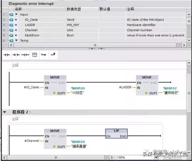 图16 诊断程序 在诊断程序中,我们可以获取错误IO状态,硬件标识符和通道,并添加了STP指令。当错误发生时候,使PLC处于STOP状态,若不添加STP指令,PLC仍以RUN状态运行。
